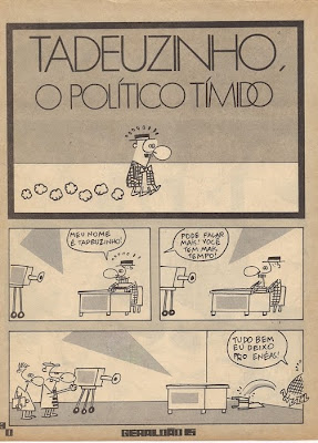 Quando os Tres Amigos estiveram aqui no Recife para o festival de quadrinhos (Festival Internacional de Humor e Quadrinhos, em Recife, em 2002) falei com ele brevemente sobre essa tira do Kuzuza, que eu tinha achado muito legal. Ele disse que pelo pansexualismo, rendeu reclamações de vários leitores na Folha de SP. Saiu no cadernoFolhateen, em 10 de setembro de 2001, segundo a anotação que eu fiz no alto. Já a do Tadeuzinho, o político tímido, rolou na Geraldão n. 15 (novembro de 1989).